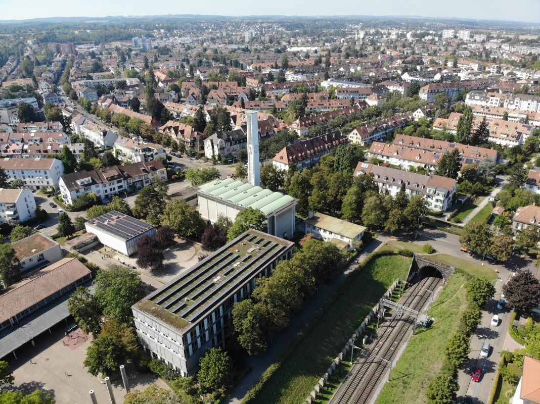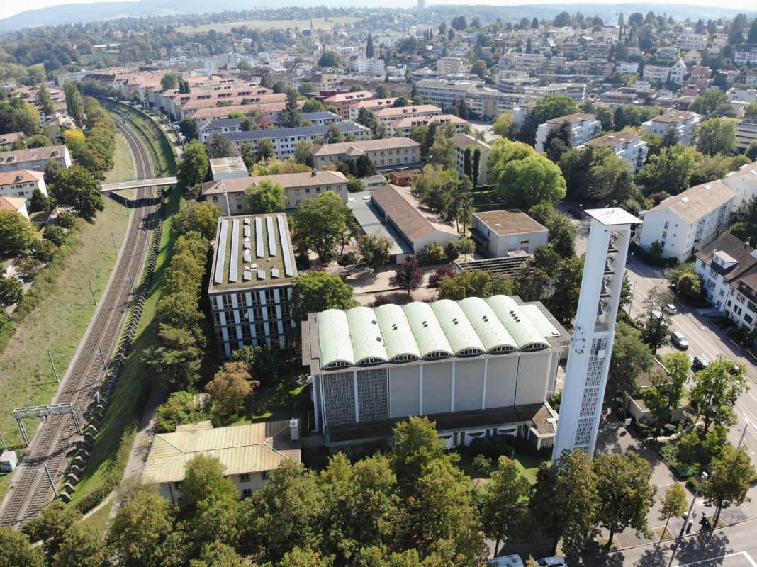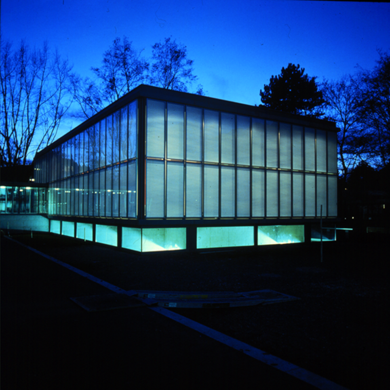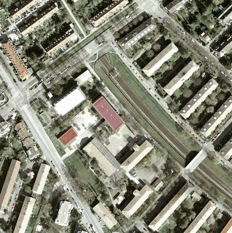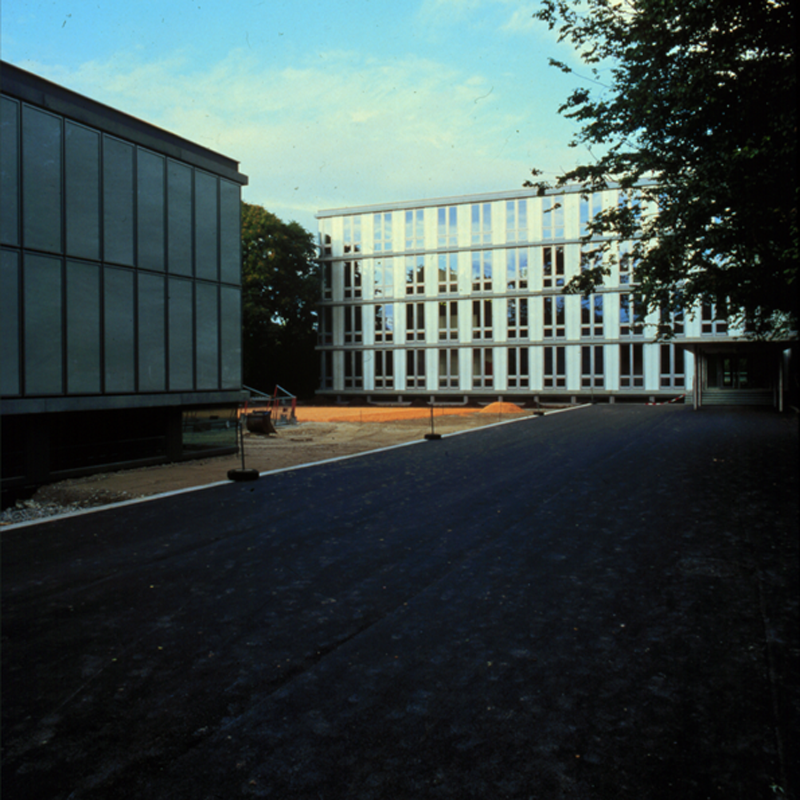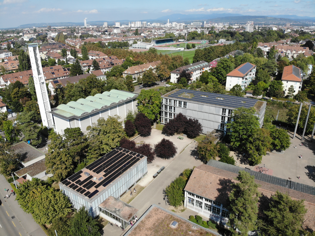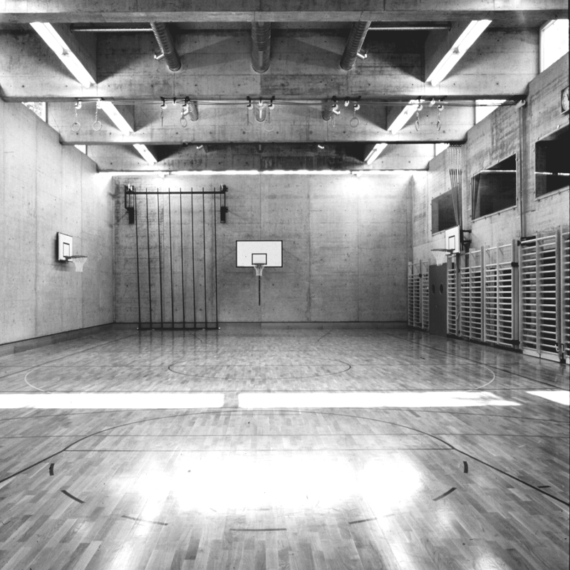 Die markante Zäsur der französischen Bahnlinie und die Verkehrsachse des äusseren Rings prägen den Ort, der eine Nahtstelle zwischen der Stadt der Jahrhundertwende, der Bebauung der 20er-Jahre und den Zeilenbauten der 50er-Jahre darstellt. Die bestehende Schulanlage von G. Panozzo wird im Nordwesten durch die Allerheiligenkirche von Hermann Baur begrenzt. Während im neuen Klassentrakt sämtliche Unterrichtsräume angeordnet sind, nimmt das zweite Gebäude Aula und Turnhalle auf. Im Verbund mit dem Bestand entsteht eine neue, in sich verständliche städtebauliche Ordnung. Geschosshohe, als transparente oder reflektierende Glaspaneele ausgebildete Elemente prägen das Äussere des Klassentraktes. Die Hülle der Aula besteht aus Glaselementen mit Glasgespinsteinlagen. Im Innern entsteht so der Eindruck einer transluziden, papierenen Fassade, und nachts tritt das Gebäude als grosser Leuchtkörper in Erscheinung.