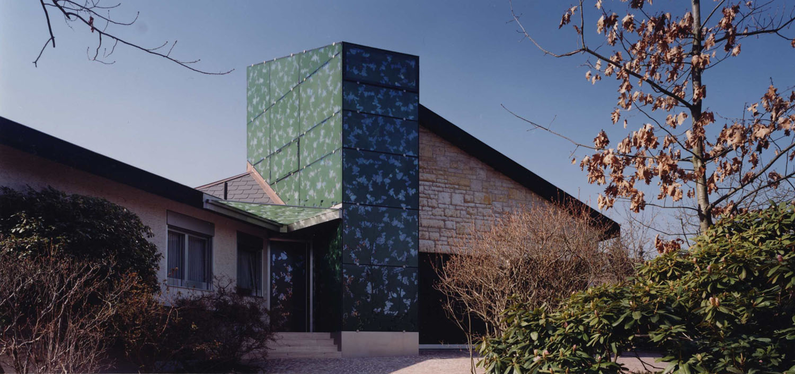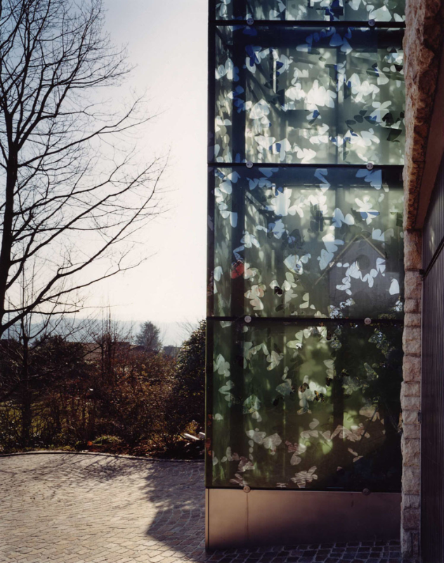 Ein repräsentatives Wohnhaus mit einer komplexen Geometrie wird um einen vertikalen Gebäudeteil erweitert. Die Fassade aus siebbedrucktem Glas nimmt das Motiv des Ahornblattes in der Auf- und Untersicht auf. Durch die Überlagerung der Punktrasterung entsteht in der Wahrnehmung eine Bewegung, die an jene von Blättern im Wind erinnert.
