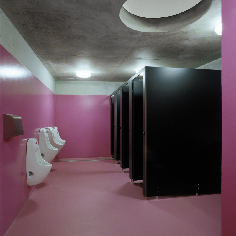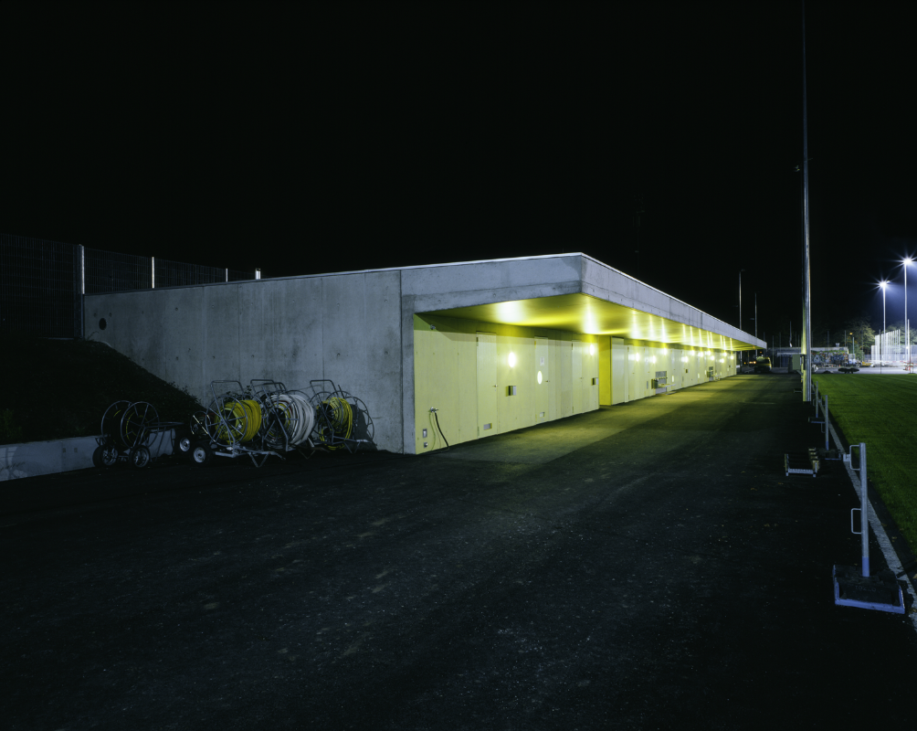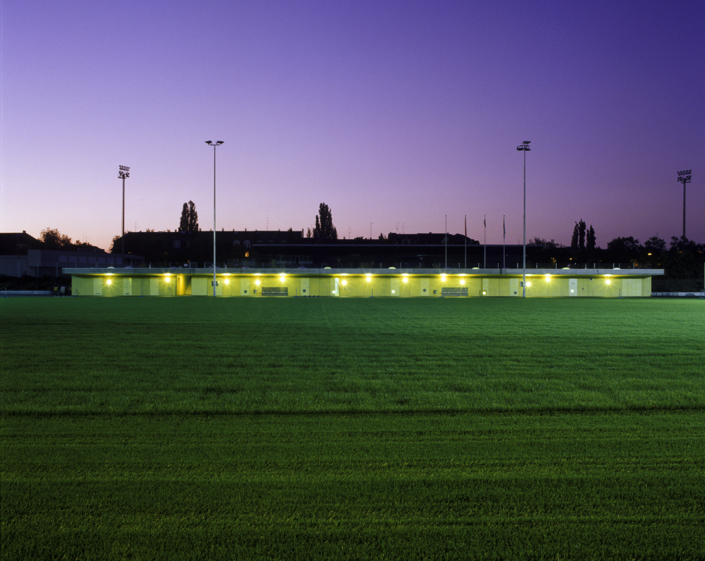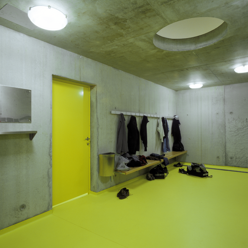Seit den 1990er-Jahren wurde die Schützenmatte in Basel schrittweise zu einer Sportanlage umgewidmet. Das neue Garderobengebäude ersetzt die hölzernen Pavillons von 1932 durch einen langen, passgenau in den Bestand eingeschriebenen, einhüftig organisierten Baukörper mit weit auskragendem Vordach. Dieses ist funktionales und räumliches Element zugleich: Es bildet die Vorzone der direkt von aussen erschlossenen Räume und dient bei Regen Sportlern wie Publikum als Unterstand.
