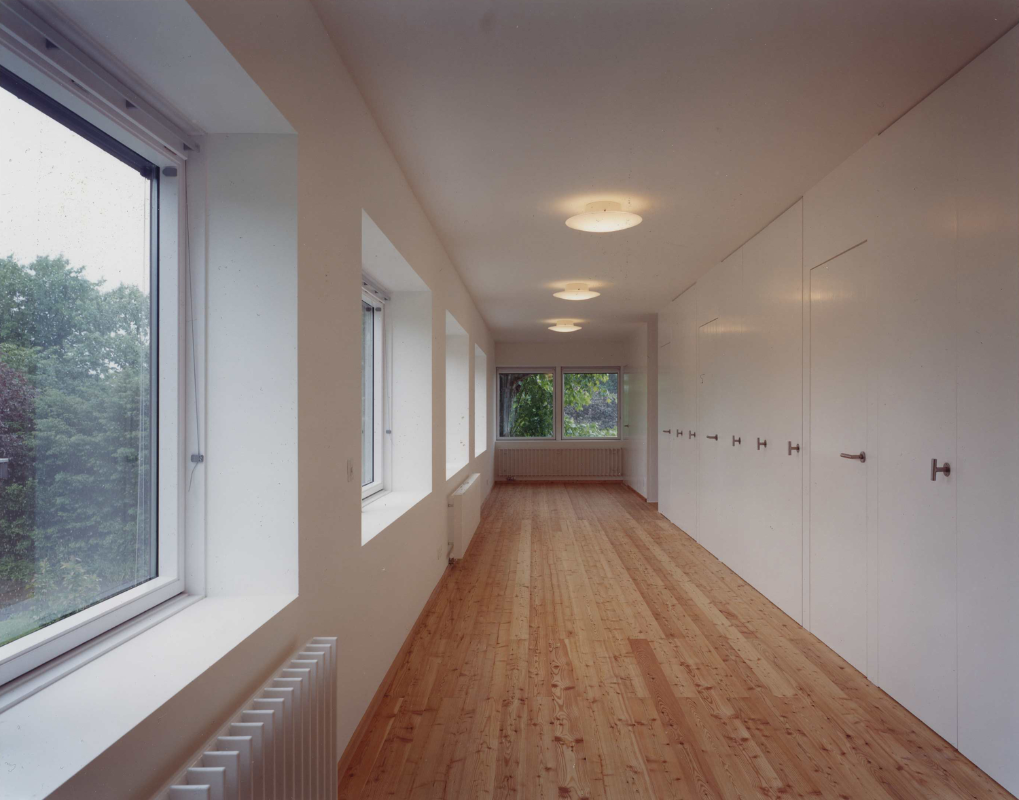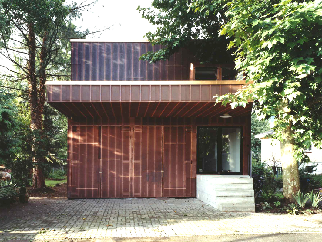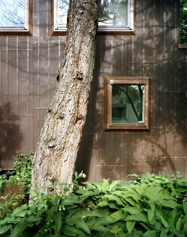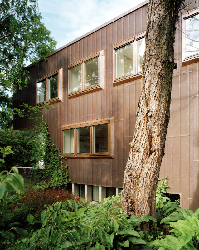 • Erweiterung eines bestehenden Wohnhauses in Witterswil (SO). Der neue Baukörper erhält eine textil anmutende, kupferne Fassade mit kastenartig die Hülle durchbrechenden Fenstern.