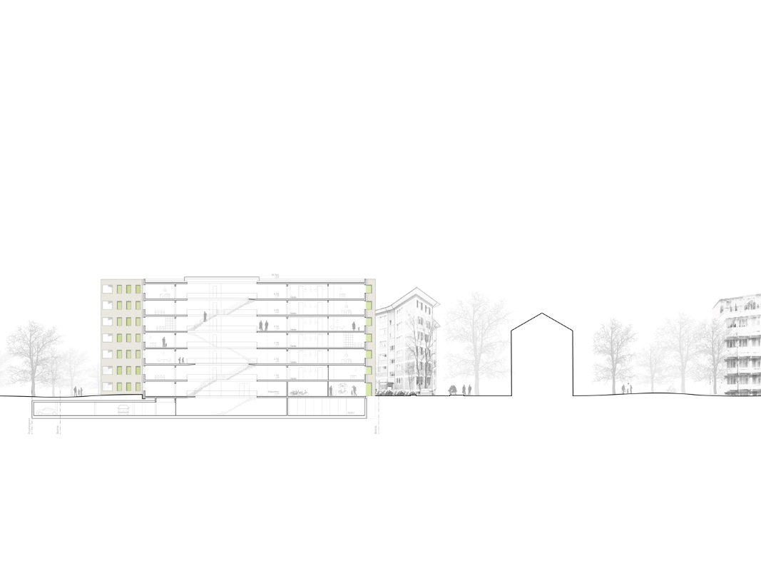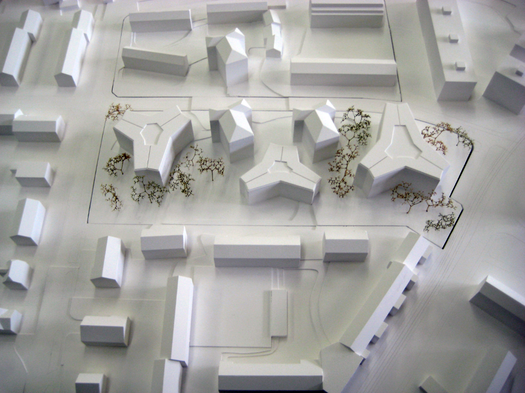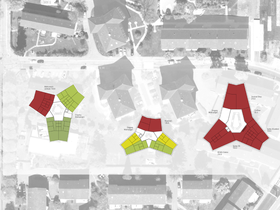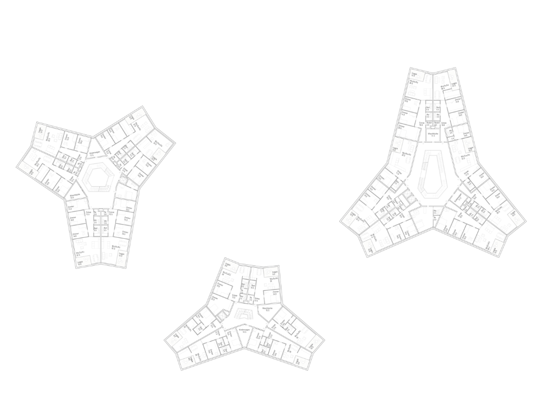 Die drei neuen, in der Höhe gestaffelten Punkthäuser mit Y-Grundriss sind zeitgemässe Interpretationen der Architektur Albert Heinrich Steiners und zeichnen sich durch grosse Kompaktheit, optimierte Fassadenabwicklungen und überzeugende Wirtschaftlichkeit mit konzentrierten Erschliessungen aus, mit denen 6 bis 9 Wohnungen pro Geschoss erschlossen werden. Die Setzung der Häuser garantiert eine räumliche Transparenz im Sinne Steiners. Es entstehen schöne Sichtbeziehungen, eine angenehme Durchlässigkeit und damit eine hohe Aufenthaltsqualität.