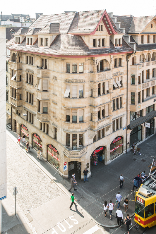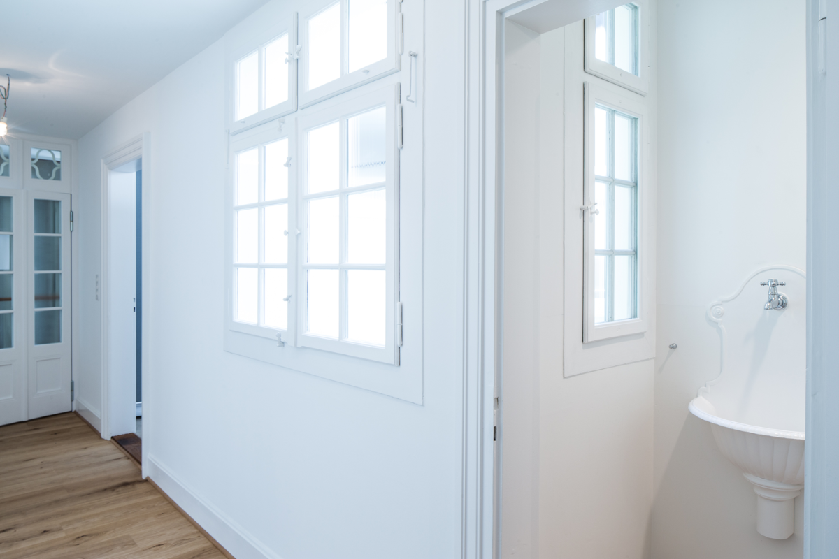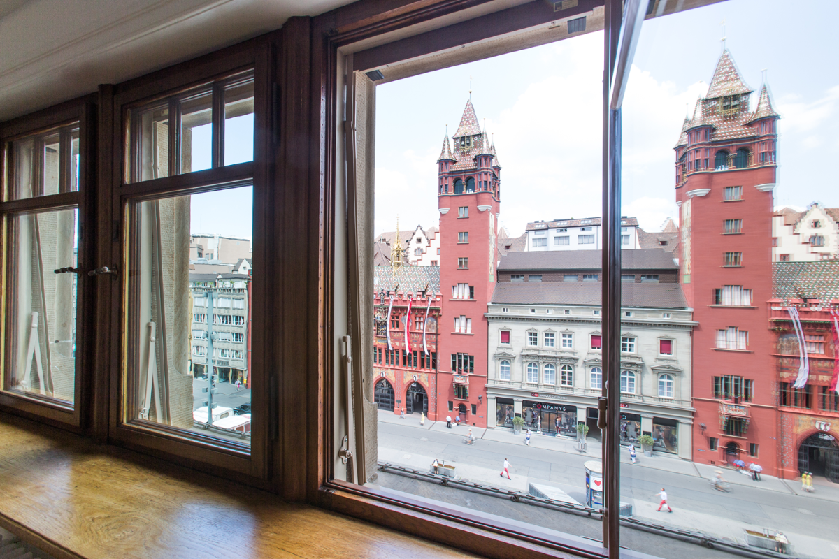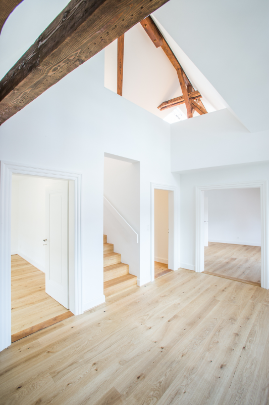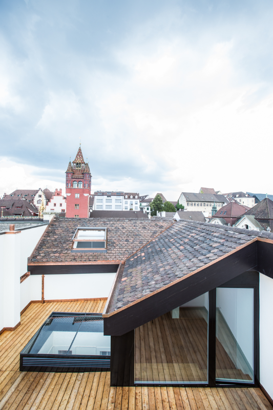 Im Zuge der Dachsanierung des denkmalgeschützten Wohn- und Geschäftshauses von 1913 wurde die oberste Wohnung umfassend renoviert und ausgebaut, und zwar so, dass ein zweigeschossiger Wohnraum mit Galerie und eine grosse Dachterrasse realisiert werden konnte. Durch die neue Grundrissdisposition, die geänderte Weg- und Lichtführung sowie einem hofseitigem Dacheinschnitt entstand eine Stadtwohnung, die sowohl vom Blick auf das geschäftige Treiben am Marktplatz, als auch von der Ruhe des Innenhofes profitiert.