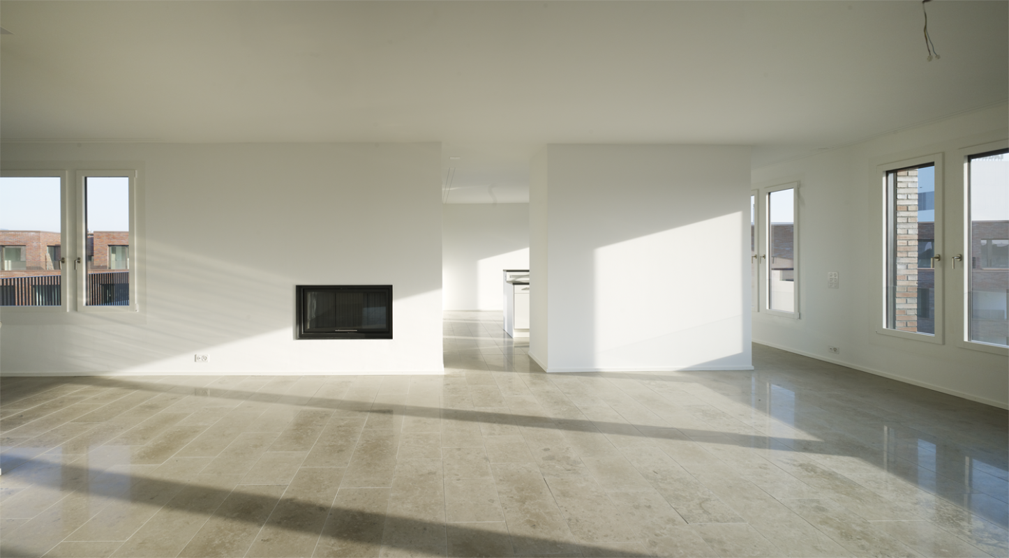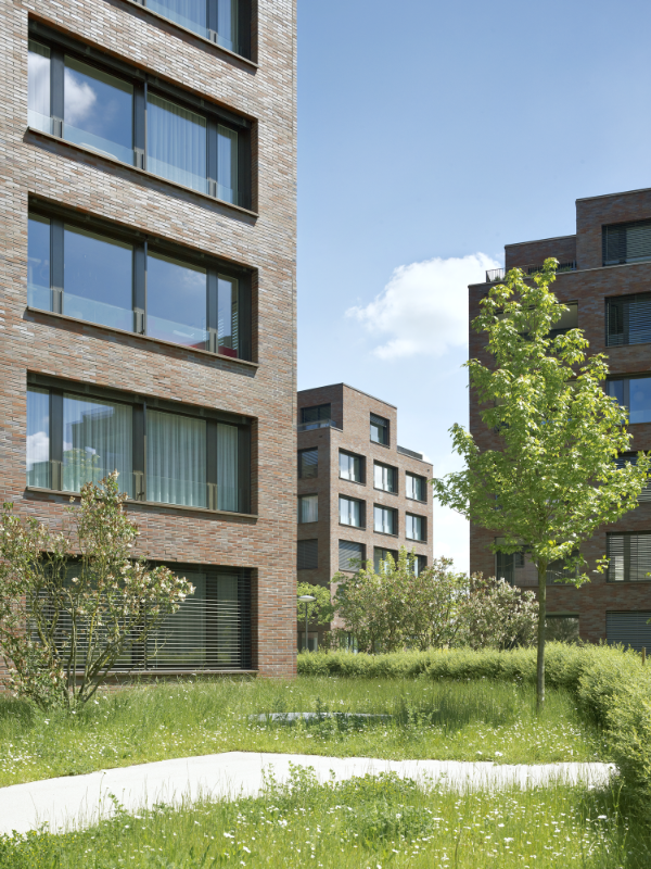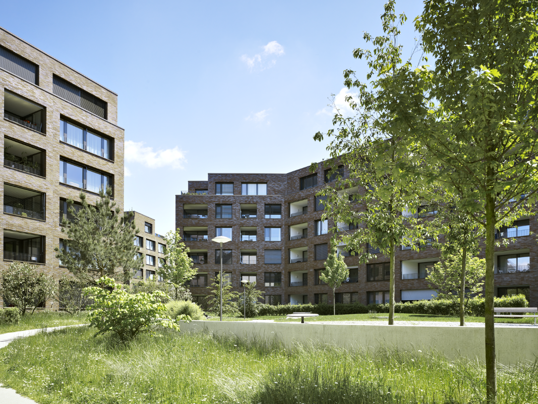 Die beiden sechsgeschossigen Wohnbauten vermitteln geschickt zwischen bestehenden Blockrandfragmenten, Einzelbauten und dem angrenzenden, grossmassstäblichen Einkaufszentrum. Auf dem vormals industriell genutzten Areal entstanden 99 Wohnungen ganz unterschiedlichen Typs und Charakters. Trotz hoher Dichte ermöglicht die Abwinkelung der Baukörper gezielte Ausblicke ins Weite und diagonale Blickbezüge innerhalb der Überbauung. Zudem entstehen mehrdeutige Aussenräume, die spürbar gefasst und dennoch von fliessender Offenheit sind. Während der nördliche Baukörper orthogonal strukturiert ist, sind beim südlichen die Erschliessungskerne leicht ausgedreht, wodurch die Wohnungen an Grosszügigkeit gewinnen.