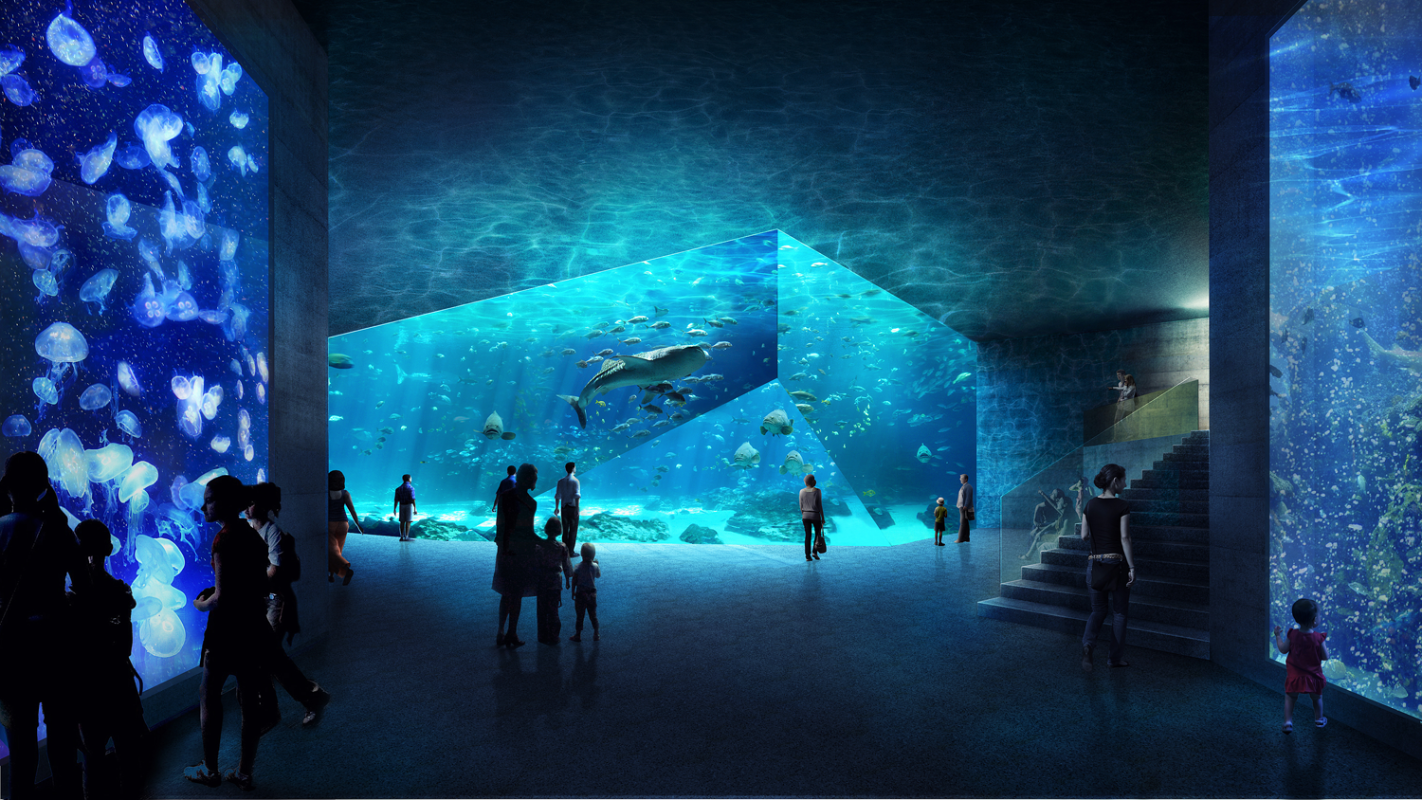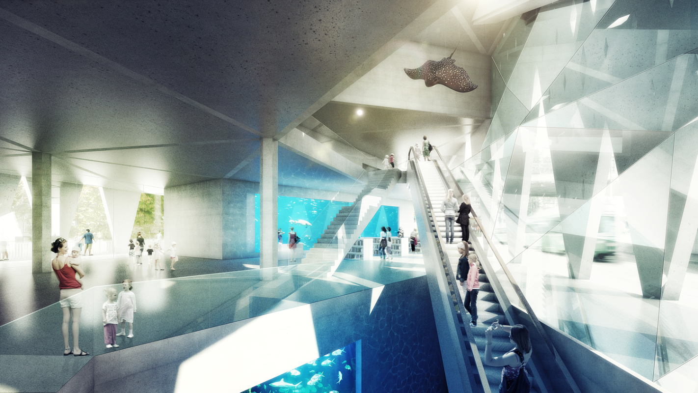 Das neue Ozeanium fügt sich in die Massstäblichkeit der Markthalle, des Hochhauses zur Steinenvorstadt, des Heuwaageviadukts und des Rialtobades ein. Der Weg der Besucherinnen und Besucher folgt den Vorgaben des Programms, welche die Thematik der Meeresströmungen aufnimmt und einen geschlossenen Zyklus vorsieht. Über eine raffiniert gestaltete Choreographie, die den Erlebniswert der Ausstellung zusätzlich steigert, werden die Besuchenden immer wieder mit räumlich reichhaltigen Ereignissen konfrontiert. Der Rundgang basiert auf einer funktionellen Anordnung der Aquarien sowie der zugehörigen Technik- und Serviceräume. Miteinander verbunden, entstehen für Unterhalt und Tierpflege direkte Wege.