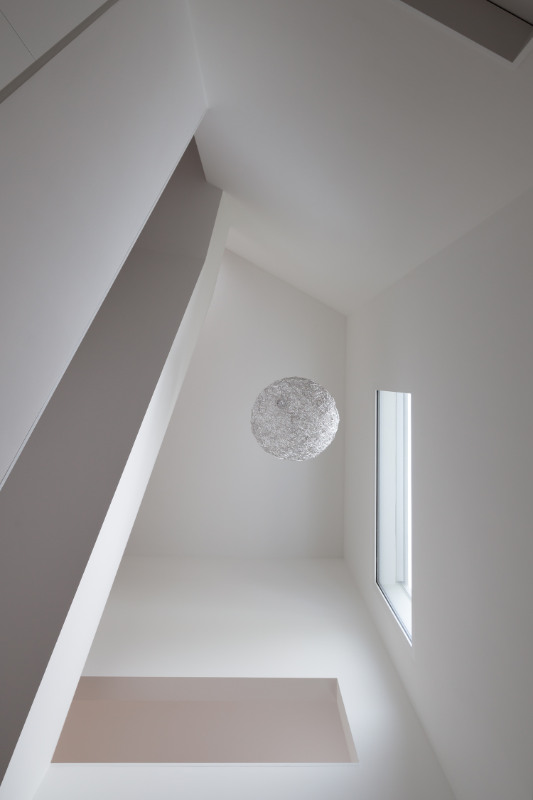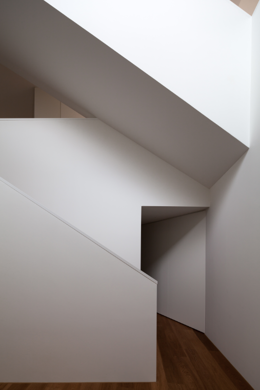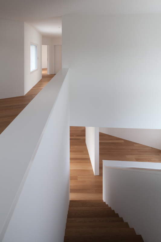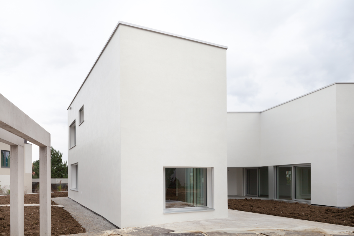 Das an leicht erhöhter Lage in Binningen situierte Wohnhaus ist charakterisiert durch eine hufeisenförmig geknickte, nach Westen ausgerichtete und einen Hofraum bildende Volumetrie, welche die privaten Aussenräume umschliesst und ihnen die geforderte Privatheit verleiht. Eine dreigeschossige Treppenhalle verbindet die verschiedenen Geschosse auf eindrückliche Art und Weise.