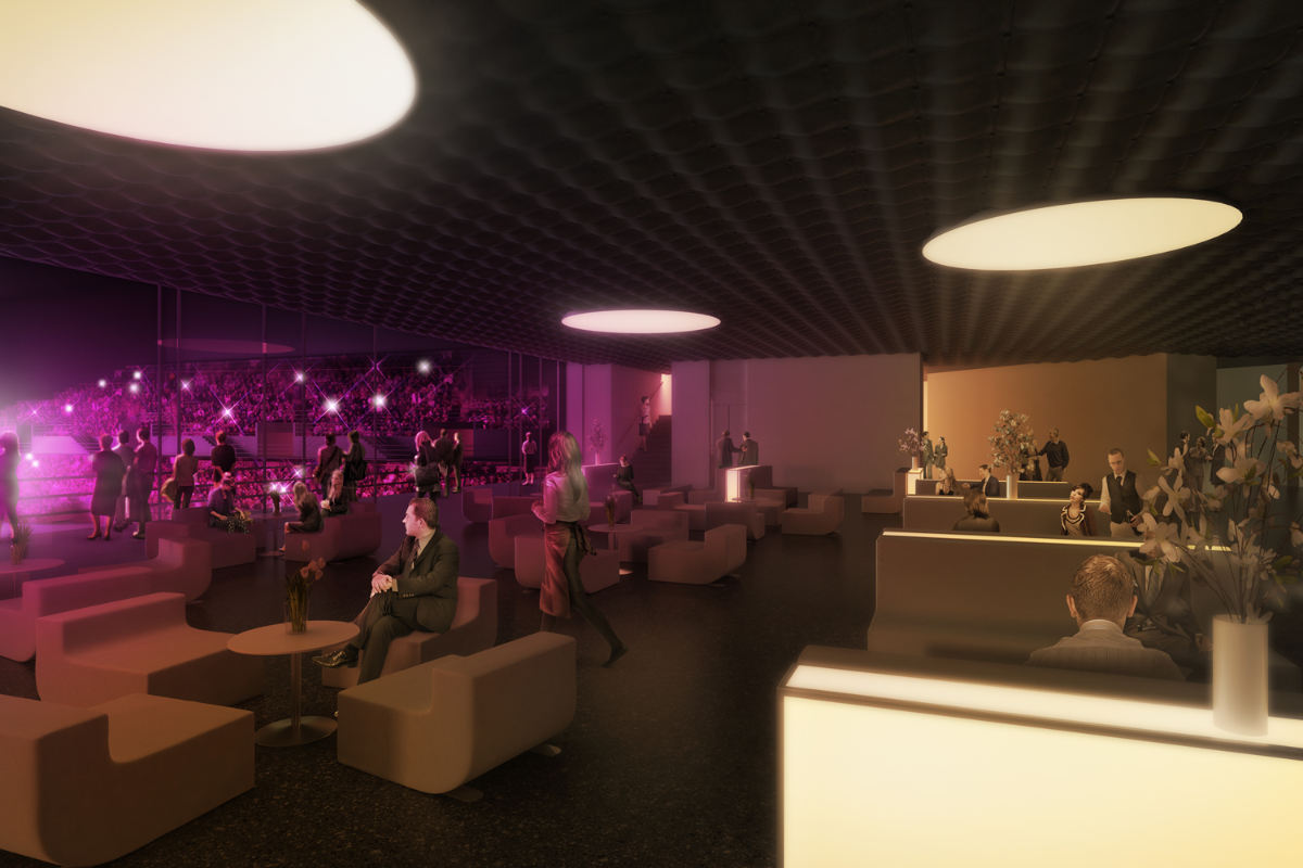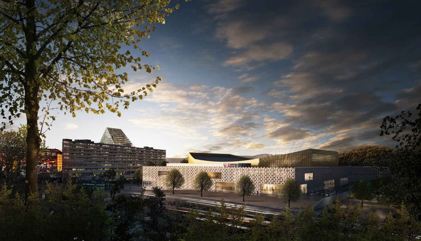 Das Hauptmerkmal des Projektes ist die veränderte äussere Erscheinung der Halle, die für internationale Grossanlässe wie die Swiss Indoors mit bis zu 10'000 Zuschauern genutzt wird. Der bis anhin markante Hallenbau verschwindet hinter den Umgängen und kann sich nicht mehr als identitätsstiftender Baukörper zeigen. Deshalb wird die Arena mit einer eigens entwickelten, goldeloxierten Verkleidung aus Aluminiumpaneelen im Sinne einer Krone in Szene gesetzt. Hinter dieser Fassade befinden sich grossformatige Öffnungen, welche die Innenräume im Stadtraum verorten können und Blicke auf die imposante umgebende Kulisse präzise freigeben.