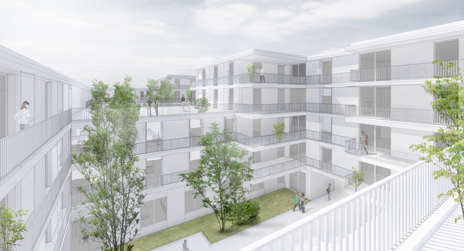 Die entspannte Architektur in einer Holz-Verbund-Konstruktion führt zu einfachen und räumlich qualitätsvollen Wohnungen, welche aus den Anforderungen des täglichen Lebens heraus entwickelt sind. In Ergänzung dazu erlauben grosse Gemeinschaftsräume und Terrassen auf den Geschossen ein zukunftsfähiges und nachbarschaftlich verpflichtendes Wohnen. Die Freiräume sind massstäblich gegliedert und differenziert gestaltet. Insgesamt entsteht eine räumlich reiche und erlebnisdichte Welt, ein vielfältiges Stück Stadt, das mit über 1000 Bewohnerinnen und Bewohnern das Herz von Leutschenbach sein wird.