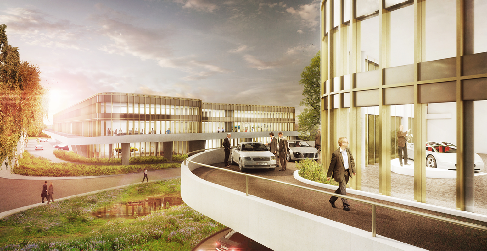Der Neubau für die AMAG-Verkaufsakademie und die technischen Schulungsräume ist dem Programm entsprechend in zwei Baukörper aufgeteilt. Auf selbstverständliche Weise steht das Auto im Zentrum: Die einfache, klar zonierte Gebäudestruktur bietet mittels Rampensystem räumlich und atmosphärisch attraktive Präsentationsmöglichkeiten der neusten Modelle ebenso wie funktional optimierte, zweigeschossige Werkhallen zur Schulung. Kennzeichnendes Merkmal aussen ist die umlaufende Fahrbahn, die der Erschliessung dient und die Volumen in der Vertikalen gliedert. Der Zugang zu beiden Gebäuden erfolgt über den verbindenden, differenziert gestalteten Grünraum mit renaturiertem Bachverlauf und geschnittenen Heckenkörpern.