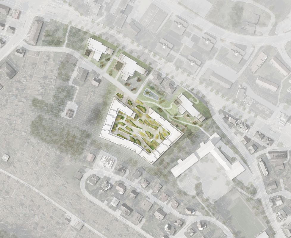 Bewusst wird in der städtebaulichen Umsetzung der Hangbebauung auf eine Weiterführung der vorgefundenen Punktbebauung verzichtet. In Anlehnung an die östliche Schulanlage wird eine zusammenhängende Gesamtform entwickelt. Die Wohnungen sind zweiseitig belichtet durchgesteckt und profitieren von der klaren städtebaulichen Situation. Sie erhalten dadurch Ausblick und Fernsicht.