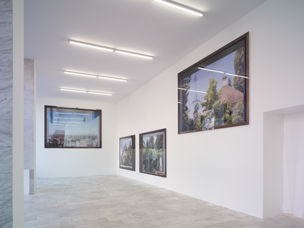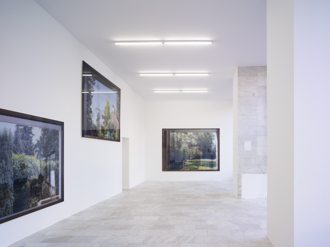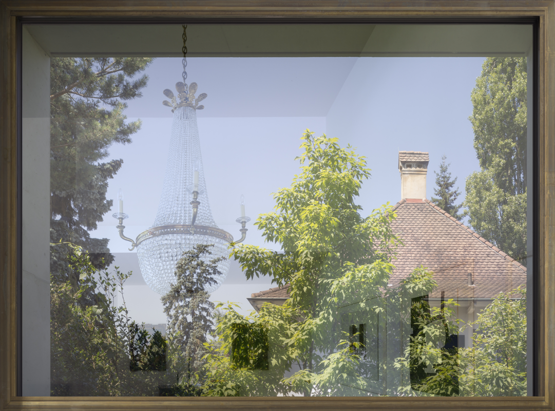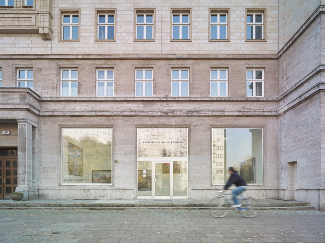 Fünf Fensterbilder im Massstab 1:1 versetzen die Besucher der Architektur Galerie Berlin in das Generationenhaus in Binningen, entworfen von Luca Selva Architekten aus Basel. Gerahmt von den bronzenen Fensterrahmen als Teil der Fotografien, treten die Aussicht auf die Stadt Basel, den parkähnlichen Garten und die ausschnittweise sichtbaren Gebäude der Nachbarn in einen überraschenden Dialog mit dem Ausblick in die Karl-Marx-Allee. «Acht Fenster» heisst folglich die Ausstellung, weil die drei Schaufenster der Galerie integraler Bestandteil der Installation sind.