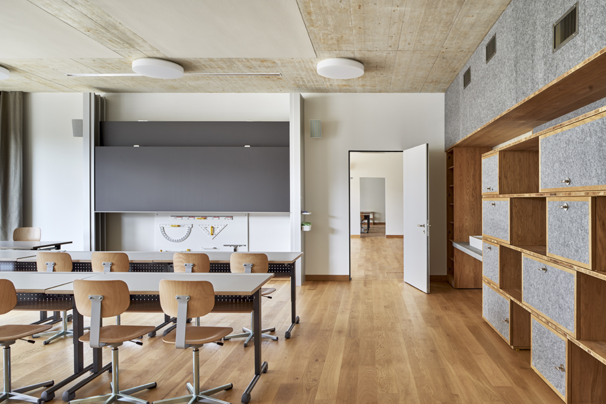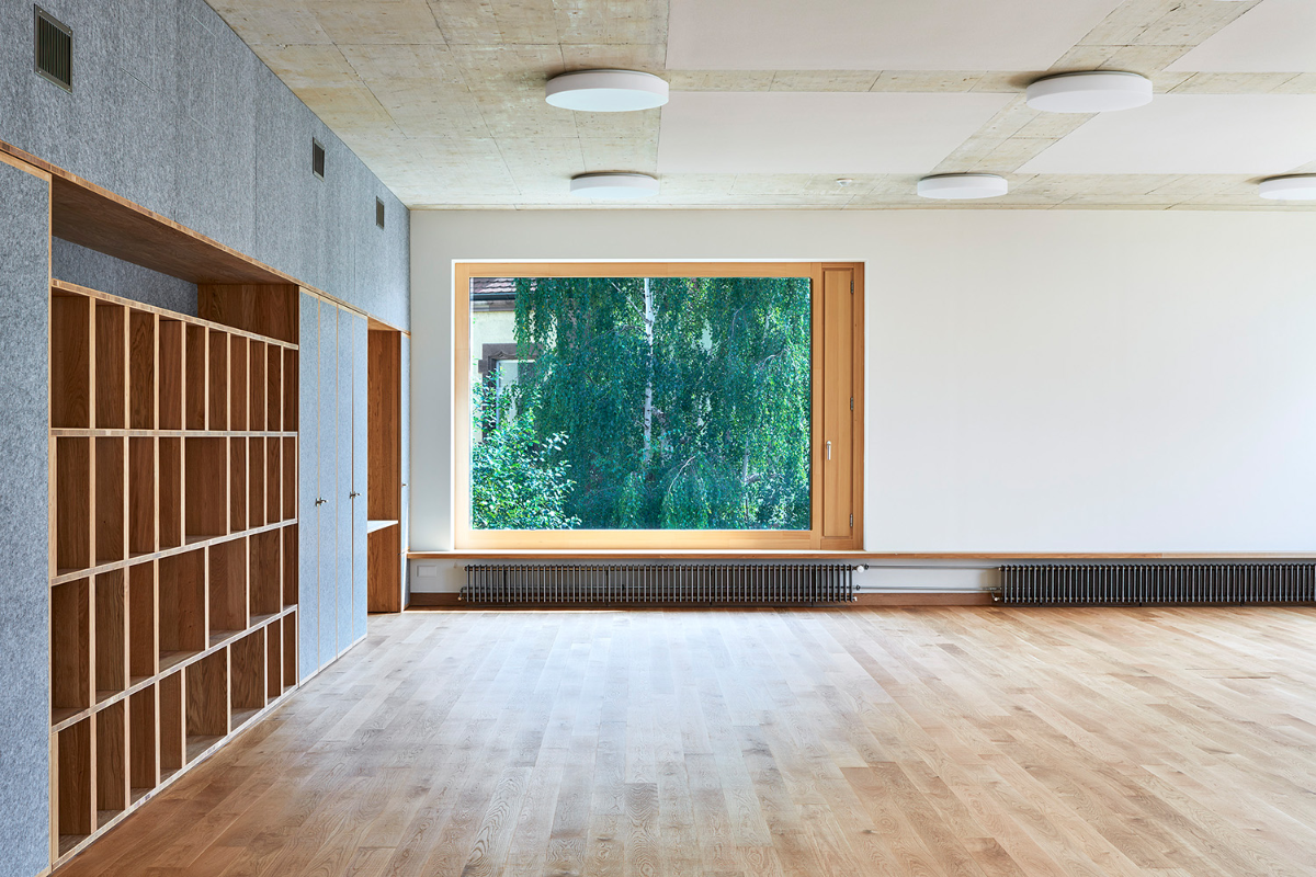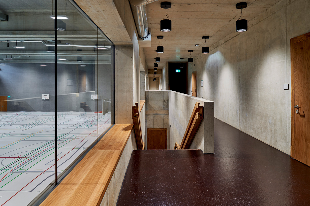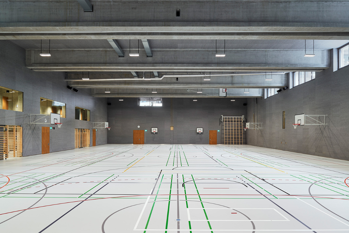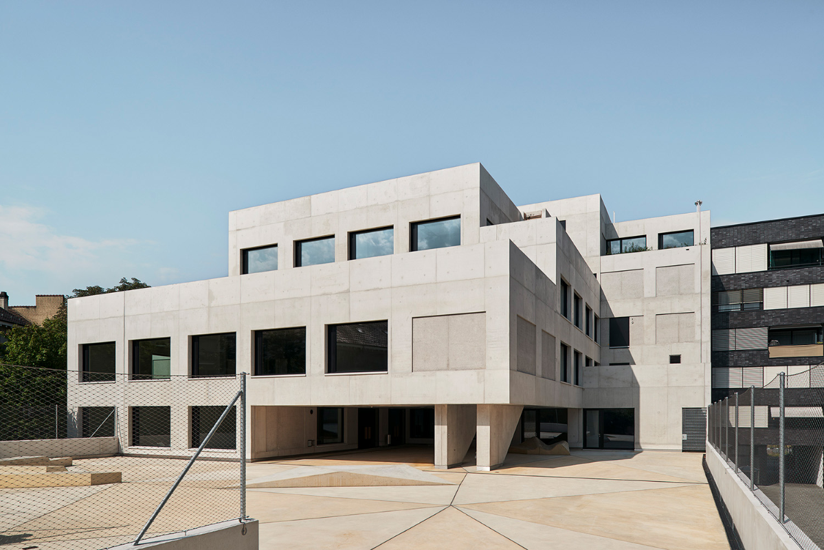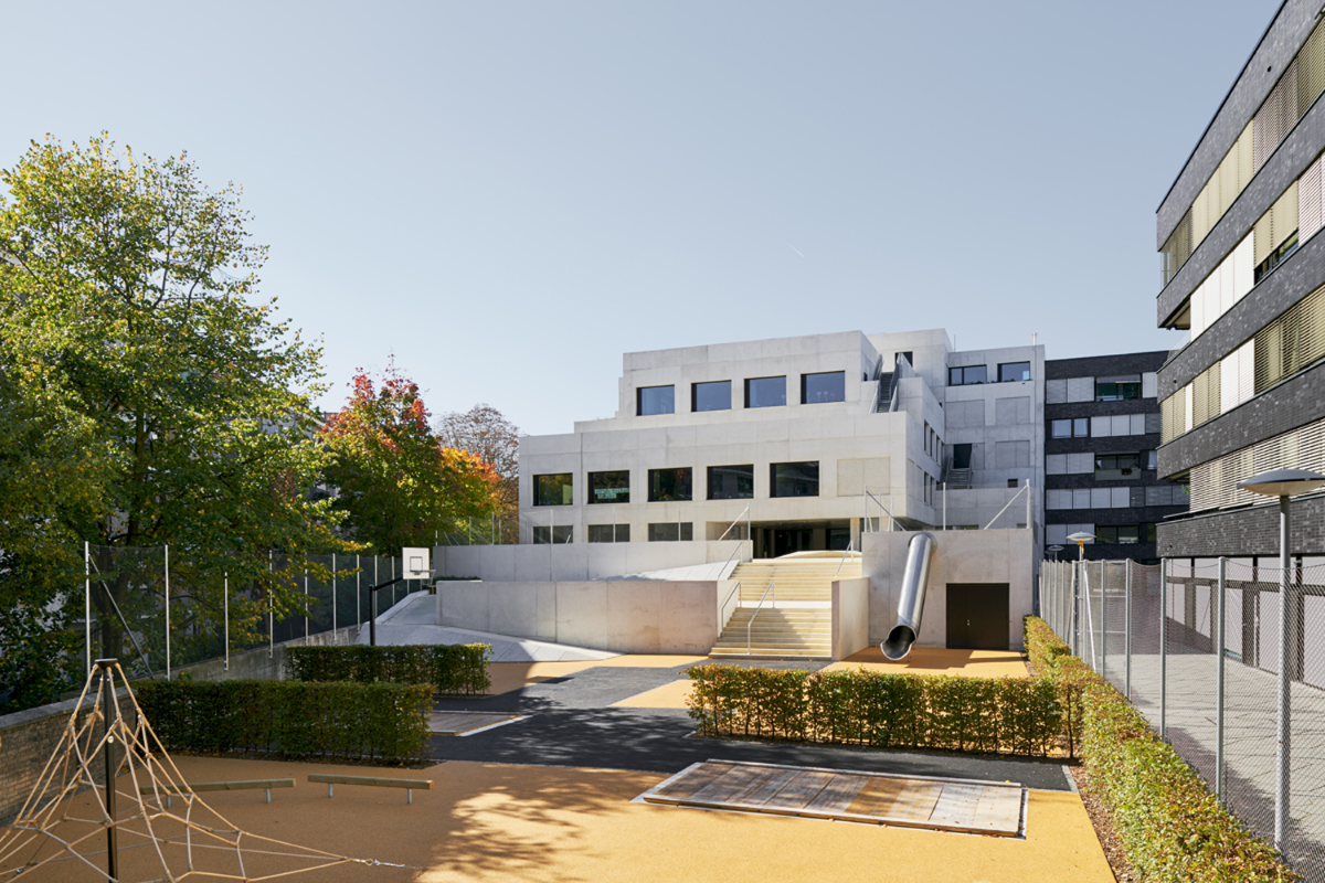 Die bestehende städtebauliche Figur findet im mehrfach abgetreppten Volumen des Primarschulhauses ihren Abschluss. Der öffentliche Charakter des Gebäudes manifestiert sich in der Fassadengestaltung ebenso wie in der Materialisierung. Mit dieser Setzung entsteht auf entspannte Art eine vielfältige, gebrauchstaugliche Schule mit neuartiger Typologie und klaren und qualitätsvollen Aussenräumen. Die Struktur der gestuften Geschosse in Verbindung mit der Überlagerung der Turnhallen bietet eine wunderbare Grundlage zur Entwicklung hallenartiger Erschliessungen und kaskadenartiger Treppen, fluchtwegbefreit und somit uneingeschränkt nutzbar, da über die Dachgärten geflüchtet werden kann.