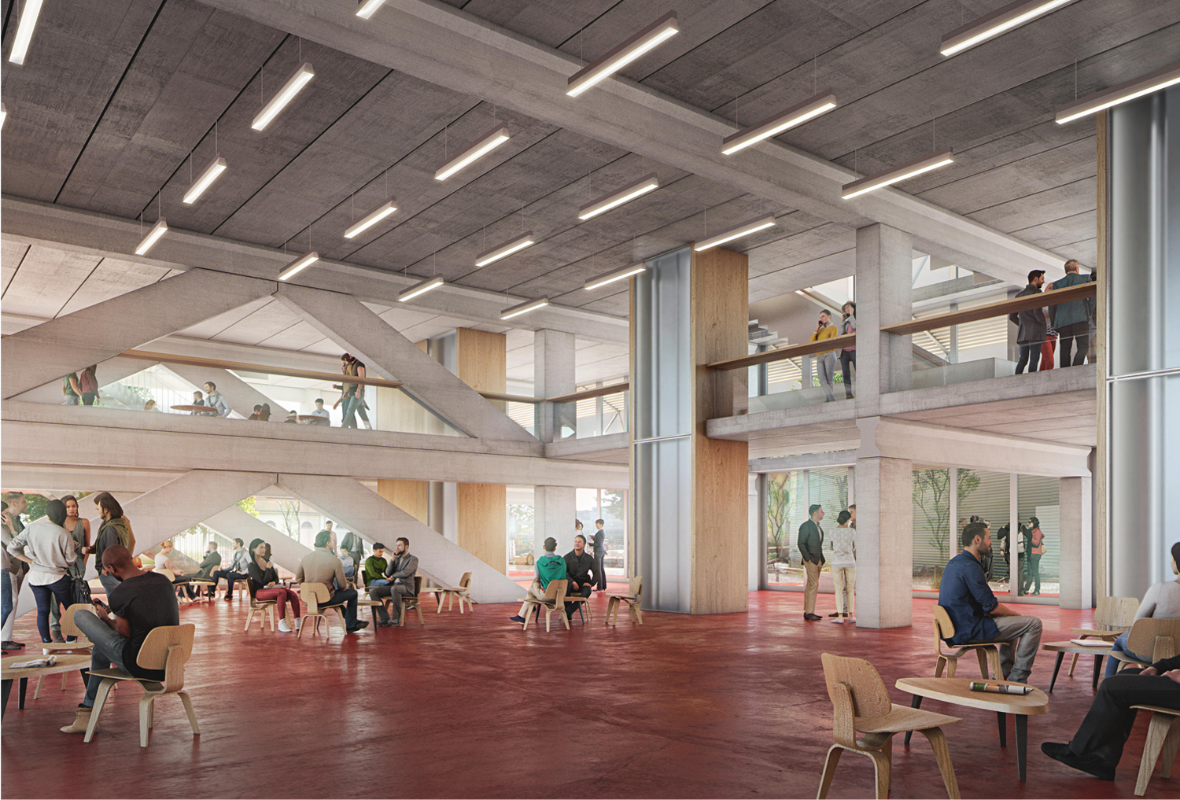 Das neue Gebäudevolumen fügt sich präzis in die räumliche Ordnung des Areals ein, das aufgrund der Planungen an der Nordspitze und dem Walkeweg künftig eine deutlich urbanere Prägung erfahren wird. Die Hauptausrichtung der neuen Hochschule erfolgt auf den Bordeaux-Platz. Das Gebäude selbst versteht sich als eine unhierarchische Plattform für Lehre und Forschung. Auf diesem Hintergrund steht das Verbindende und nicht das trennend-hierarchische im Mittelpunkt, was sich zunächst in der räumlichen Disposition niederschlägt. Herzstück des ECONOMARIUM® ist die über vier Geschosse entwickelte, über alle Unterrichtsgeschosse durchgehende lichtdurchflutete Halle. Diese Halle schafft Transparenz in alle Ebenen und versteht sich als städtischer Boulevard. Hier begegnen sich die Schulöffentlichkeit mit den Studierenden, Dozierenden und Forschenden. Hier findet Austausch des Wissens statt, hier ist der Ort für Informelles, die Halle ist auf jedem Geschoss beidseitig mit einer Terrasse verbunden, die wiederum über die Geschosse begehbar sein wird, das Herz des Gebäudes, mit festen Arbeitsplätzen an den Fassaden die Studierenden, hier kann sich das Leben einer Hochschule exemplarisch manifestieren.