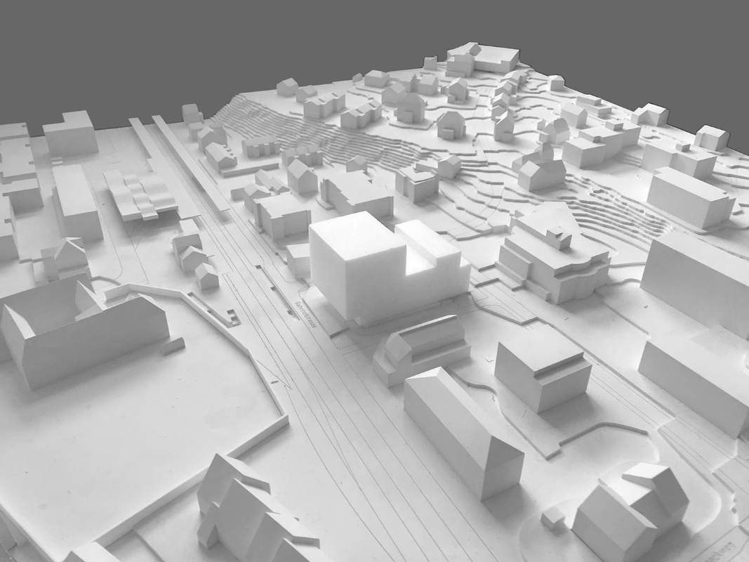 Der städtebauliche Ansatz des Projektes interpretiert zum einen die vorgefundene Topographie und schafft andererseits einen Merkpunkt entlang der Bahnlinie im Birstal. Die spezifische Lage gegenüber der Klosteranlage wird damit thematisiert und räumlich akzentuiert. Diese Idee der Verknüpfung von Landschaft und Typologie zeigt sich explizit im Längsschnitt des Hauses, der volumetrisch differenziert den Ort bespielt. Die Fassaden sind auf der Basis der architektonisch-städtebaulichen Idee entwickelt und thematisieren mit ihren eindeutig unterschiedlichen Materialisierungen die Spezifika des Ortes. Eine 'weiche' feingliederige Fassade in Holz als Gegenüber zum Kloster und ein Grid in innengedämmtem Sichtbeton auf die Bewegungsseiten der Züge verankern das Projekt präzise am Ort. Eine klare Adressierung zeichnet das Projekt aus, so werden die Personenerschliessungen durch die 'weichen' Ost- oder Westfassaden geführt, während der Verkehr von Norden und Süden durch die 'harte' Fassadenschicht erschlossen wird.