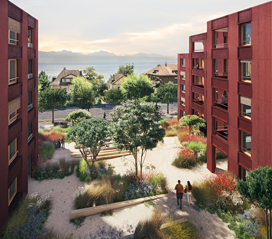 Der Ort ist an der Kantonsstrasse gelegen und ist durch eine Südlage mit Seesicht geprägt. Das bis anhin als Bürostandort genutzte Grundstück soll neu einem adäquaten Wohnen zugedacht werden. Den grossen Herausforderungen von Lärm und Aussicht wird mit drei gestuften Baukörpern begegnet, welche zum einen für alle Wohnungen eine gute Aussichtsituation schaffen, zum andern aber auch einen schönen Aussenraum mit klarer Adressierung bilden. Die vielspännig erschlossenen insgesamt rund 60 Wohnungen zeichnen sich durch fliessende Grundrisse aus, welche es immer wieder verstehen, den Bezug zur prägenden Landschaft herzustellen.