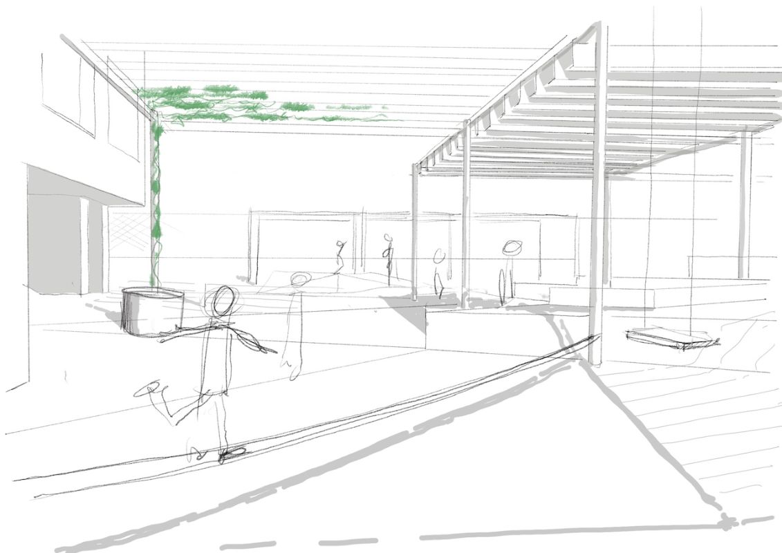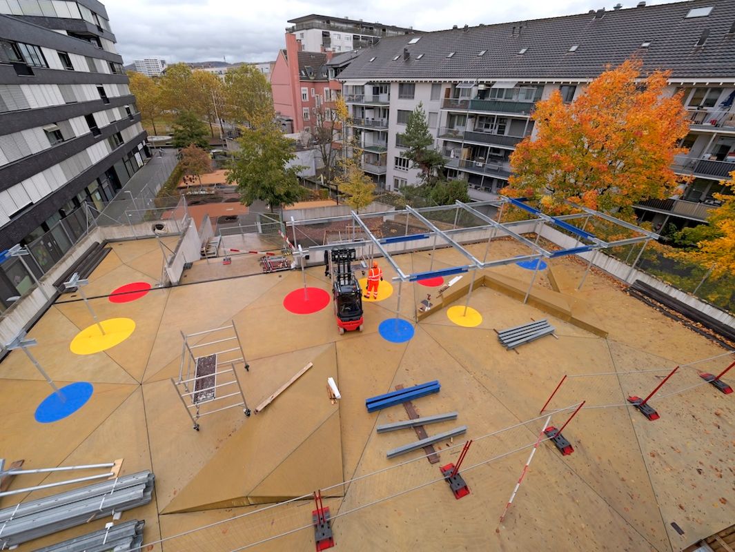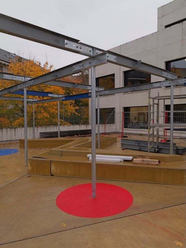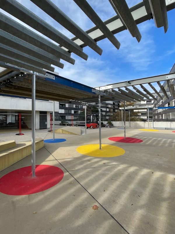 Die Terrassen des gestuften Baukörpers sind im Konzept als Pausen -und Nutzräume für den Unterricht geplant und werden auch so genutzt. Um vor allem in den oberen Geschossen die Nutzungsoptionen aufgrund des Wärmeeintrages zu vergrößern, wurde von Seiten Nutzer:innen ein Projekt zur Beschattung dieser Terrassen angestoßen. Über differenzierte Studien zeigte sich der Vorteil von lamellenartigen, luftdurchspülten und schattenspendenden Elementen, die im Sinne eines klaren Statements durch die Architekt:innen als Re-Use-Elemente definiert wurden. So entsteht eine räumlich präzise Setzung der Schattendächer auf verschiedenen Ebenen auf das mehrfach preisgekrönte Projekt. Gleichzeitig werden zusätzliche Spielangebote geschaffen, die sich unter den neuen Schattendächer entspannt entwickeln können.