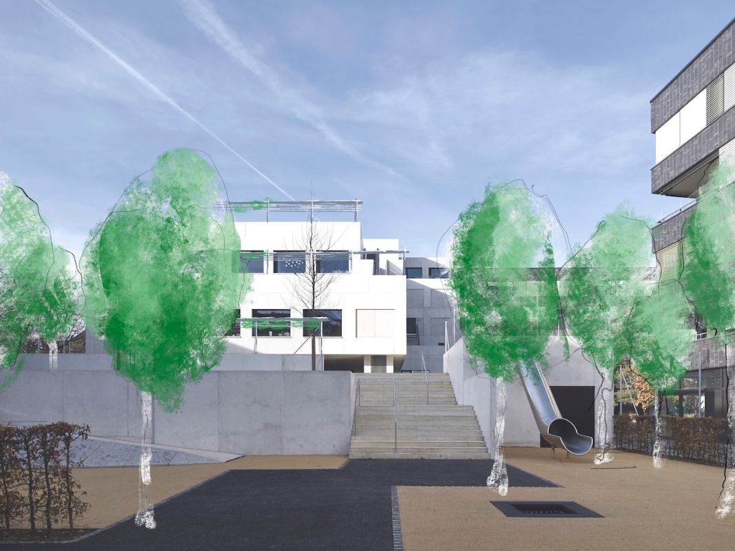 Im Anforderungsprofil nach dem Wettbewerb 2012 wurden strapazierfähige Flächen vorgegeben, welche zu einer weitgehend – mit Granulat - versiegelten Fläche mit einzelnen Baumscheiben geführt haben. Die Baueingabepläne der Landschaftsarchitekt:innen August und Margrith Künzel sahen 2014 insgesamt 40 neue Bäume vor, die auf dieser Basis nicht gepflanzt werden konnten. Nun wird diese Entscheidung unter dem Druck der Klimaerwärmung revidiert und es werden neu 35 neue Bäume gesetzt und die Versiegelung entsprechend reduziert. Aus ökologischen Gründen wird der bestehende Belag zugunsten von Baumscheiben rückgebaut, in den anderen Bereichen aber beibehalten und farblich differenziert – wo nötig – ergänzt. So entsteht ein schattiger Ort als Klimakammer, der weiterhin die Pausenaktivitäten der Schüler:innen aufnehmen kann, aber durch die höhere Verschattung und die Verdunstungskälte einen wesentlichen Beitrag gegen die sommerliche Aufheizung leistet.