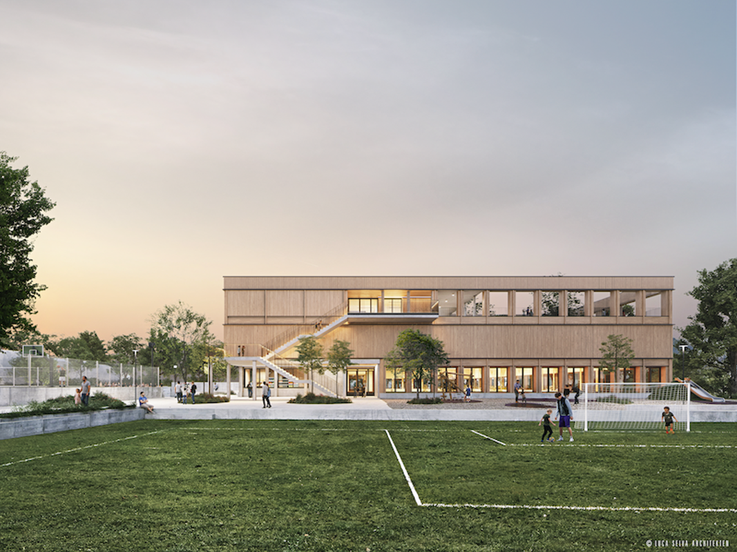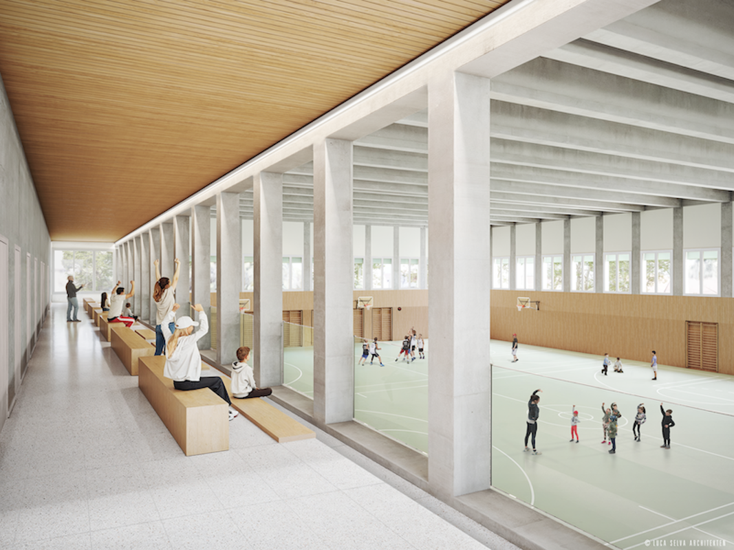 1. Preis: Dreifachturnhalle und Tagesstrukturen im Areal Unterdorf, Langnau am Albis
