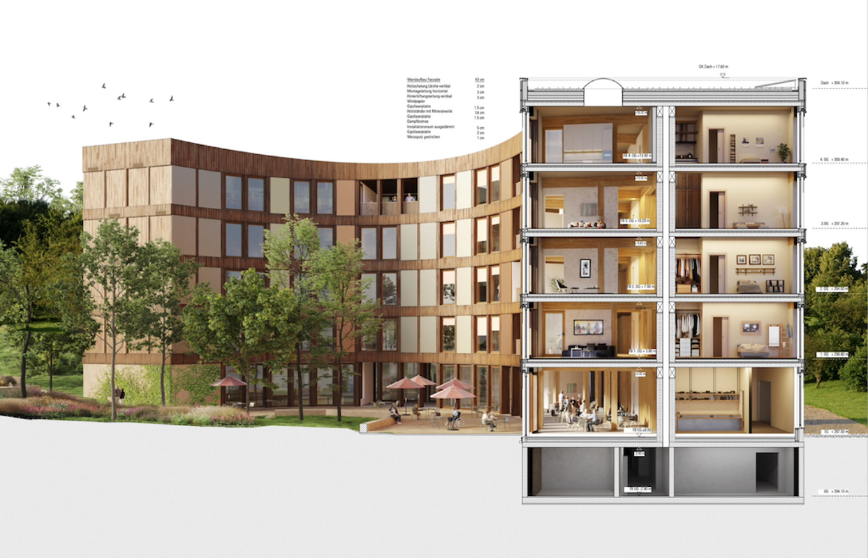 Wir haben mit dem Projekt für das Pflegezentrum am Bruderholz eine neue Typologie für Pflegeheime entwickelt, bei welcher die Zimmer konsequent vierseitig nach Aussen orientiert und den Aufenthaltsbereich auf einen gemeinsam erlebbaren Freiraum richtet. In diesem Heim gibt es Bewohnende, welche 20 Jahre und mehr an diesem Ort leben. Umso wichtiger sind hier gute Räume für den gemeinsamen Aufenthalt, wo Menschen zwar Nischen haben und dennoch sichtbar bleiben, wo sich den Menschen auf ihrem Stockwerk eine reiche Welt offenbart, eine Welt um bestehende grosse Bäume herum, die sich im Zyklus des Jahres sich immer neu präsentieren. Um diese Bäume herum entwickelt sich ein zirkulärer Aufenthaltsraum, der die notwendige Erschliessung mit den Aufenthaltsräumen koppelt und so einen wunderbaren Begegnungsraum schafft, der pro Geschoss auf die drei geforderten Wohngruppen zugeteilt werden kann Denn der Ersatzbau folgt weitgehend dem Fussabdruck des leider typologisch kaum anpassbaren Vorgängerbaus, nutzt dessen Baugrube und erlaubt so den Weiterbestand der kapitalen Bäume.Eine konsequente Bilanzierung der Grauenergie ist Basis der Umsetzung, wo wir das Ziel vom 9.0/CO2/m2/Jahr erreicht wird. Dazu tragen die optimierten Deckenkonstruktionen und die Holzfassade bei, sowie im Innenausbau die Verwendung von Lehm und Massivholz.