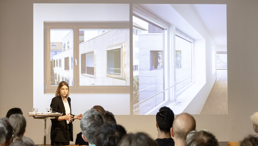 Sonja Christen im Austausch mit Daniel Tschudy von VELUX in der Schweizer Baumuster-Centrale Zürich: «Perspektivenwechsel» Dachfenster in der Fassade am Beispiel des genossenschaftlichen Neubau im Hof an der Hegenheimerstrasse aus dem Jahr 2011 von Luca Selva Architekten.